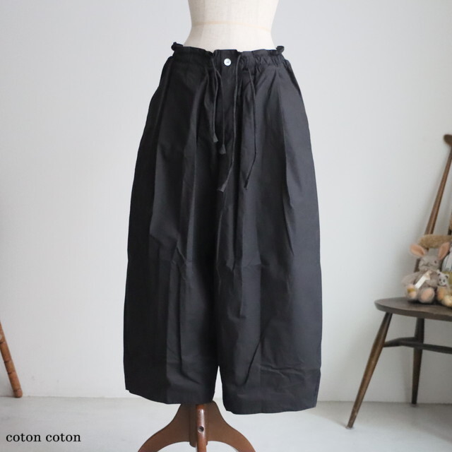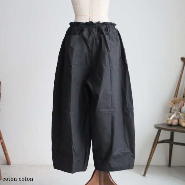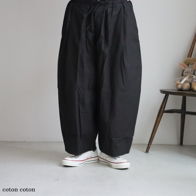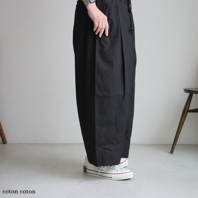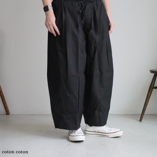 パンツはゴム+2本のドローストリングディテールのウエストと、足のラインを拾わない太さのシルエットで抜け感たっぷりの一着。