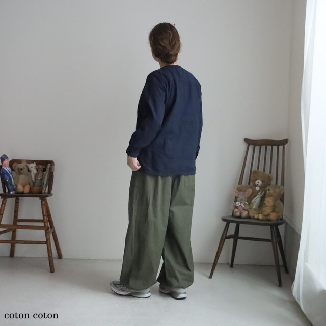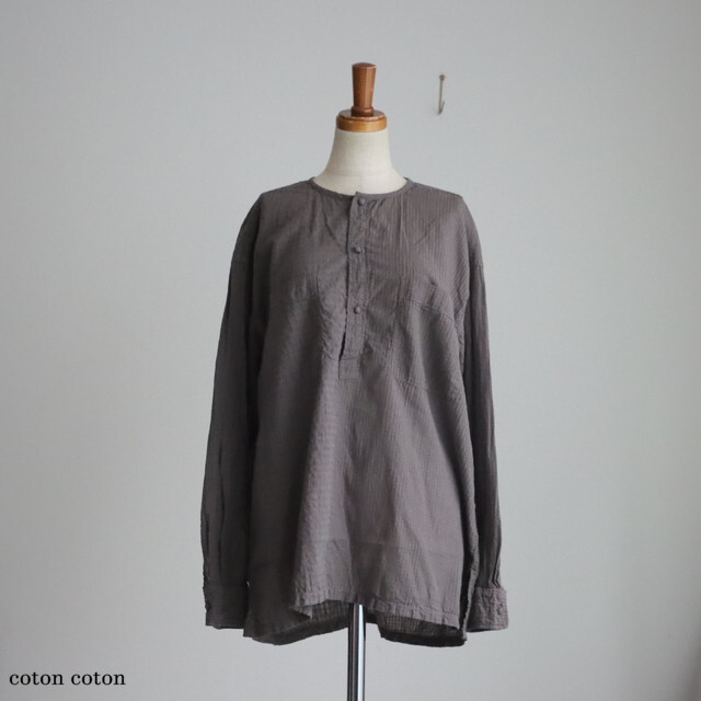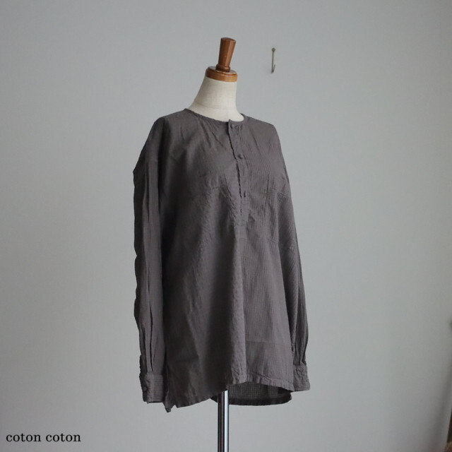 左右の身頃でチェック柄の大小を切り替えた、遊び心のあるプルオーバーシャツです。