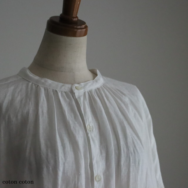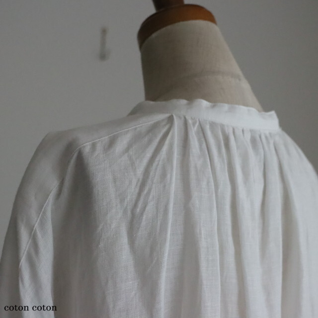 襟元や袖口のギャザーがふんわりとしたシルエット。