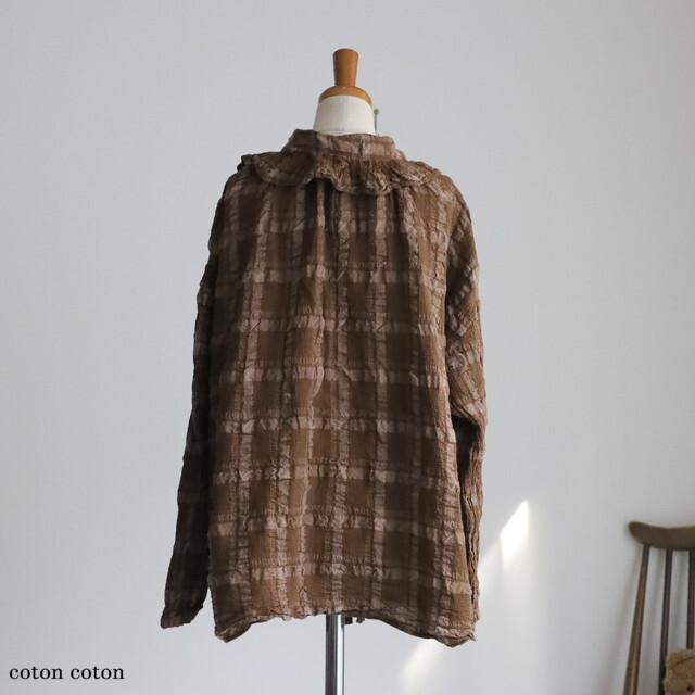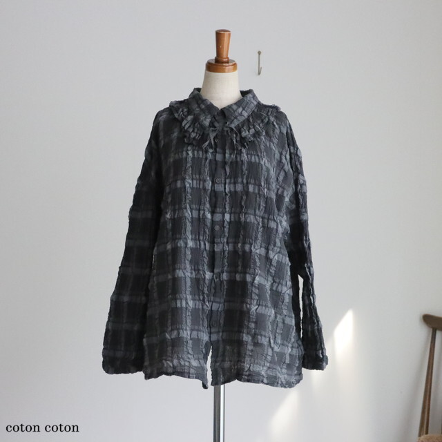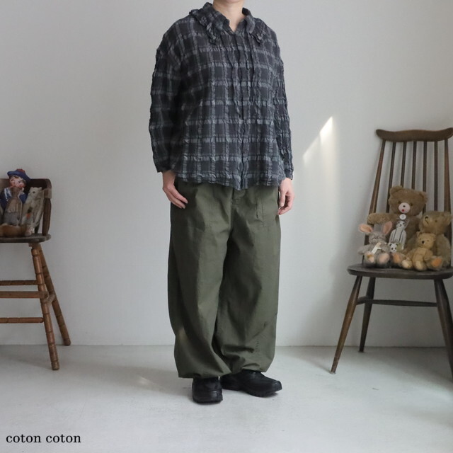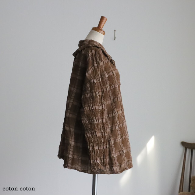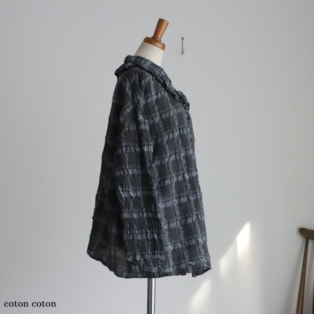 コットン、ポリエステル、リネンを交織して織られた生地に製品染めを施すことで、素材の縮みの差を活かし特徴的な凹凸を出しています。